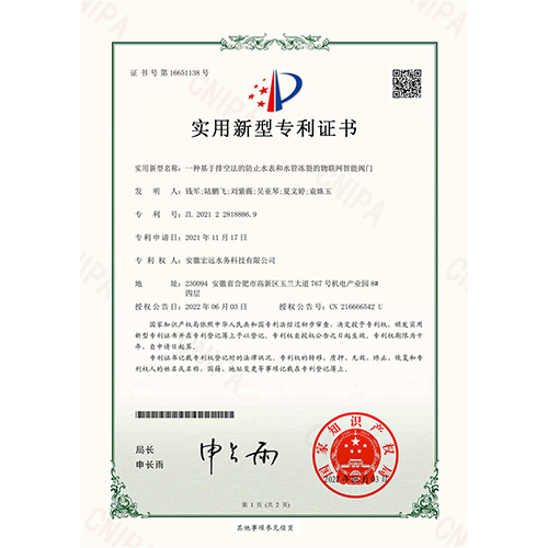 一种可用于分区计量的物联网NB-IoT阀控水表(实用新型专利证书)